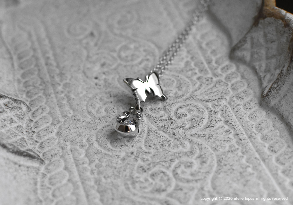 アゲハ蝶のシルエットがスタイリッシュにデザインされたトップと月をモチーフにした石枠を組み合わせたシルバーペンダント。