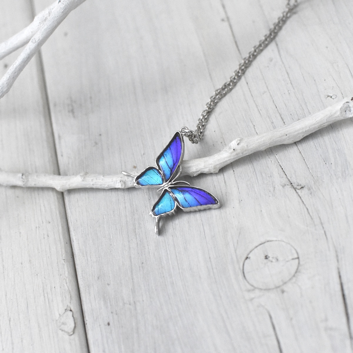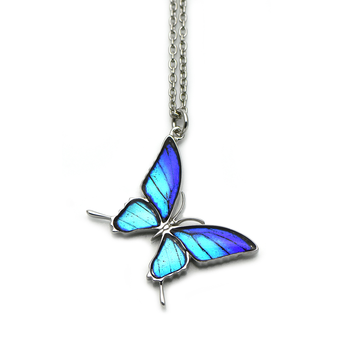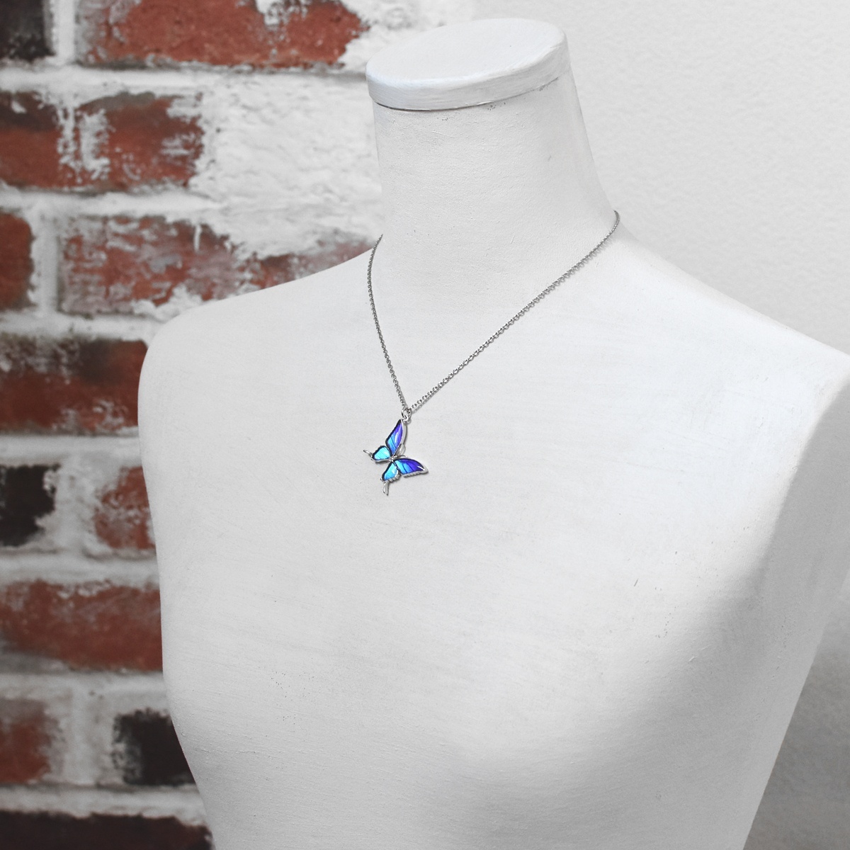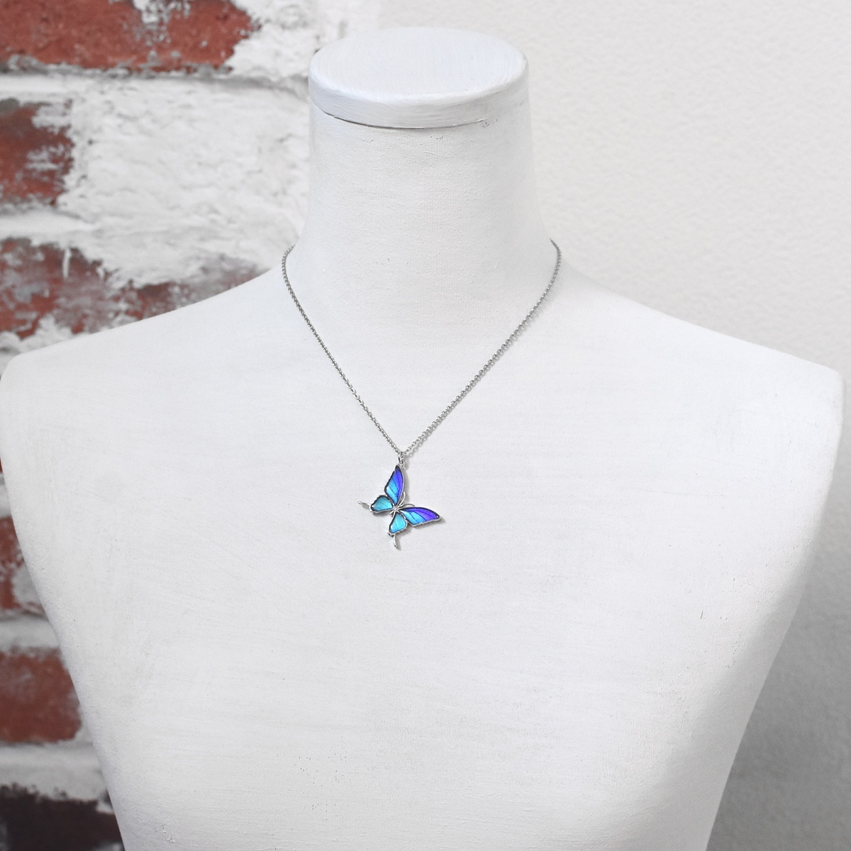 ブルーのグラデーションが印象的な蝶のペンダント。