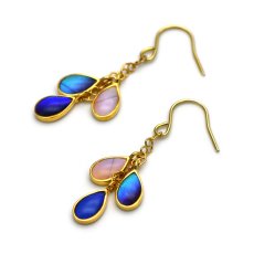 三粒の小さな雫に、三種類のモルフォ蝶の羽根を合わせたかわいいピアス。