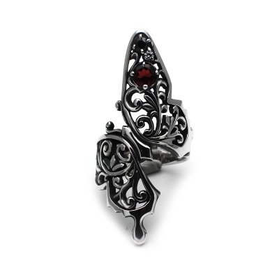 細部までつくり込まれた綺麗なラインの植物にアゲハ蝶がとまっているシルバーリング。
