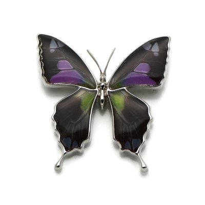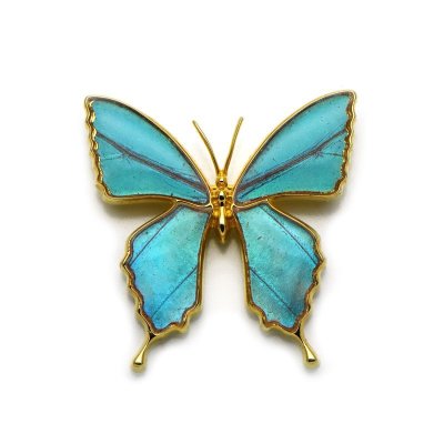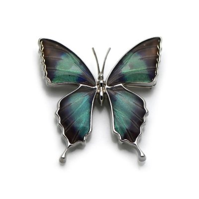 深い輝きのグリーンのグラデーションが美しい蝶のブローチ。