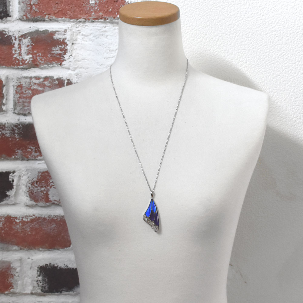 2種類の蝶の翅を使用した青のコントラストがエレガントなシルバーペンダント。