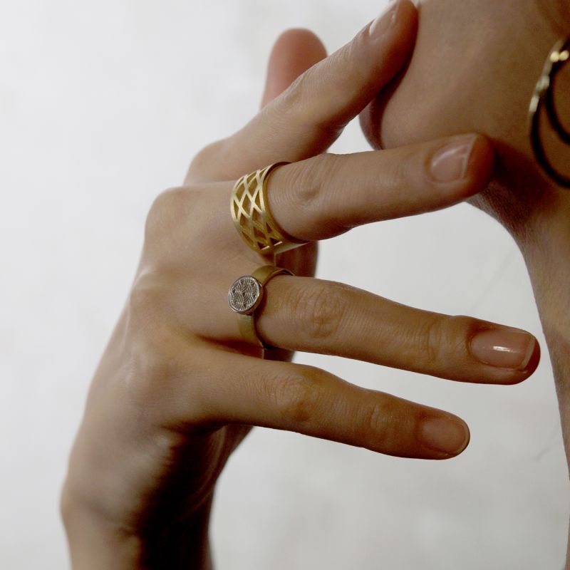 リング部分とモチーフを異色で表現し、伝統文様を細部まで丁寧に仕上げた指飾り。
