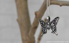 ゴシック調の繊細な模様で表現されたアゲハ蝶デザインのシルバーペンダント。