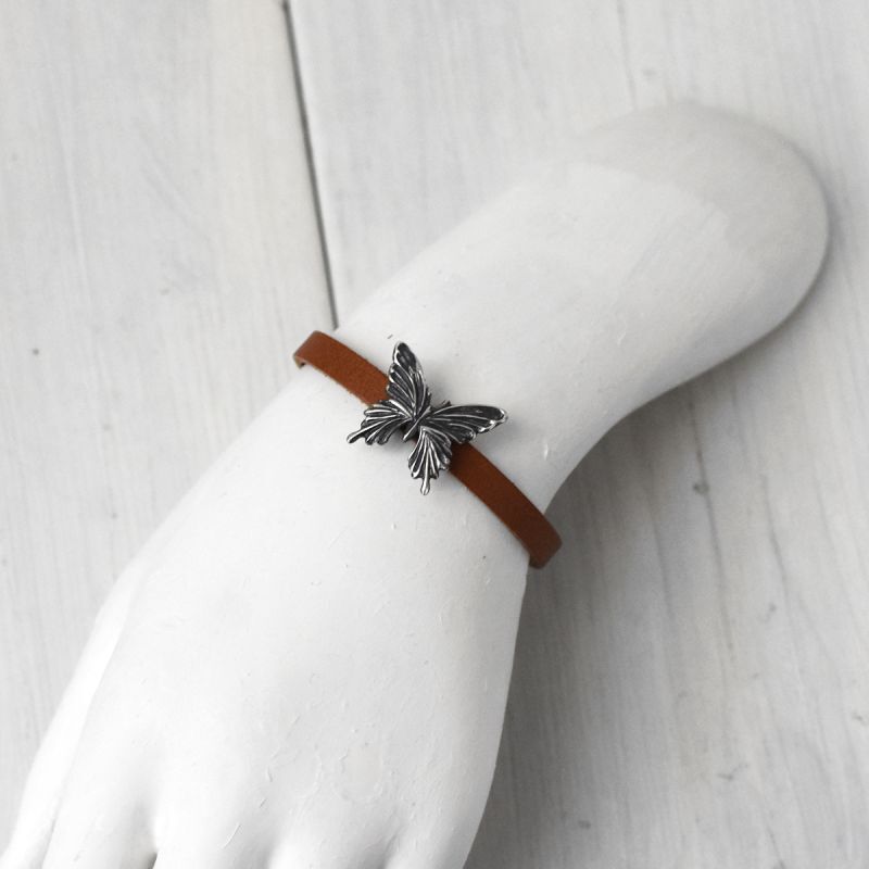 シンプルなレザーバンドとワンポイントにアゲハ蝶を組み合わせたアイテムです。