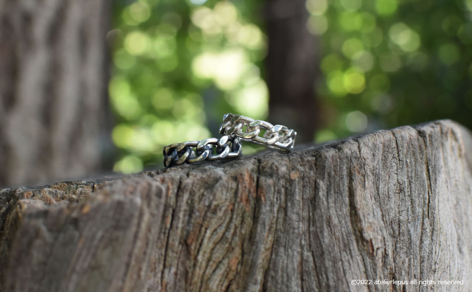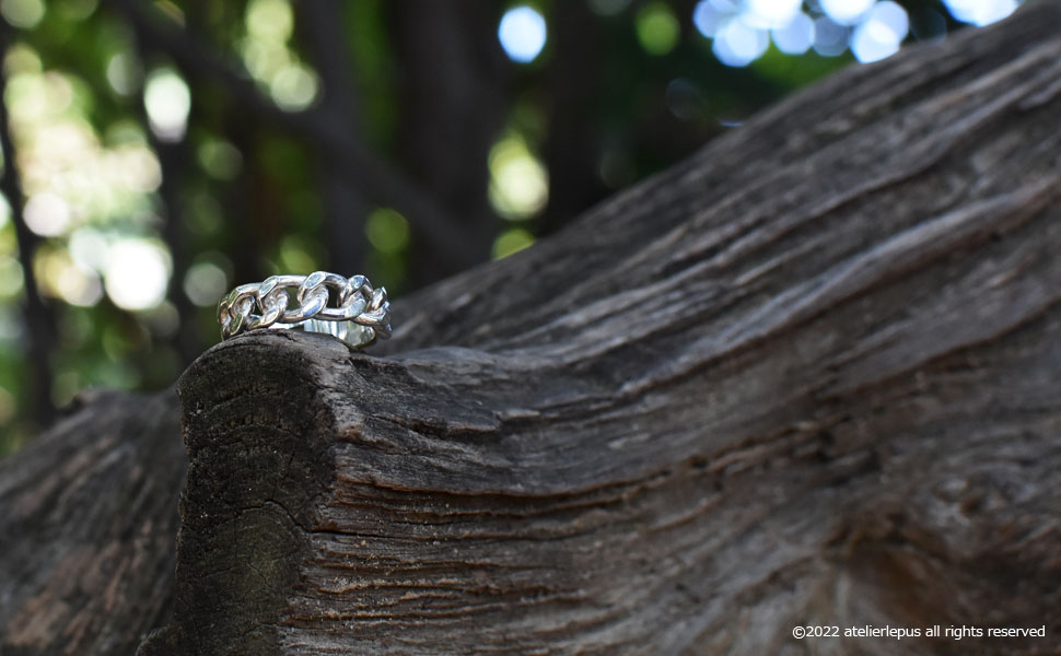 チェーンが指元を取り巻くファッション性の高いアイテムに仕上がっています。