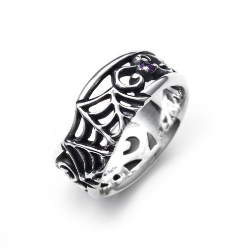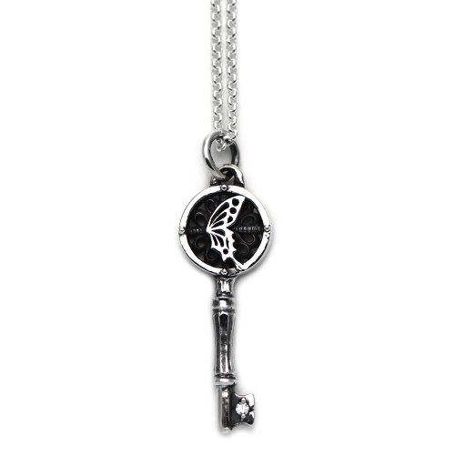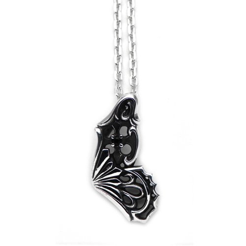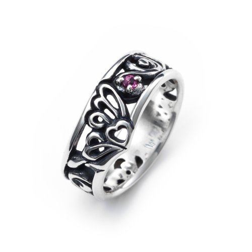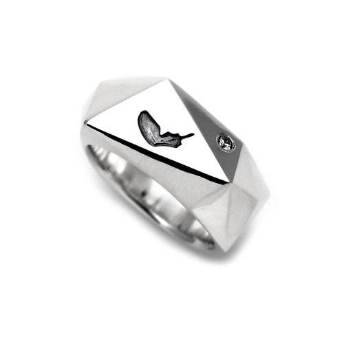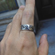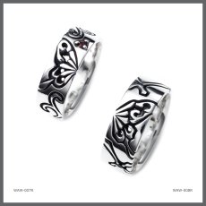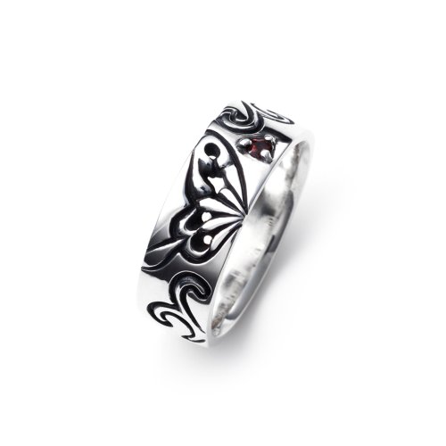 平打ち型のリングにそれぞれ対になるアゲハ蝶とクロス模様が彫り込まれています。