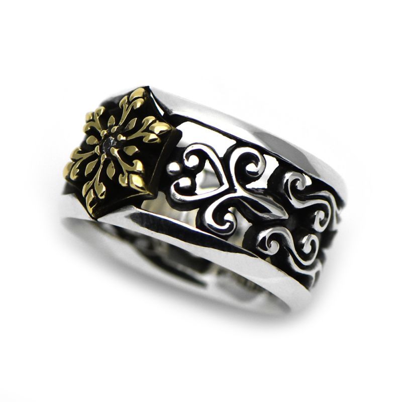 雪の結晶をブラス(真鍮)で、リング本体はシルバーで製作したコンピタイプの指輪です。