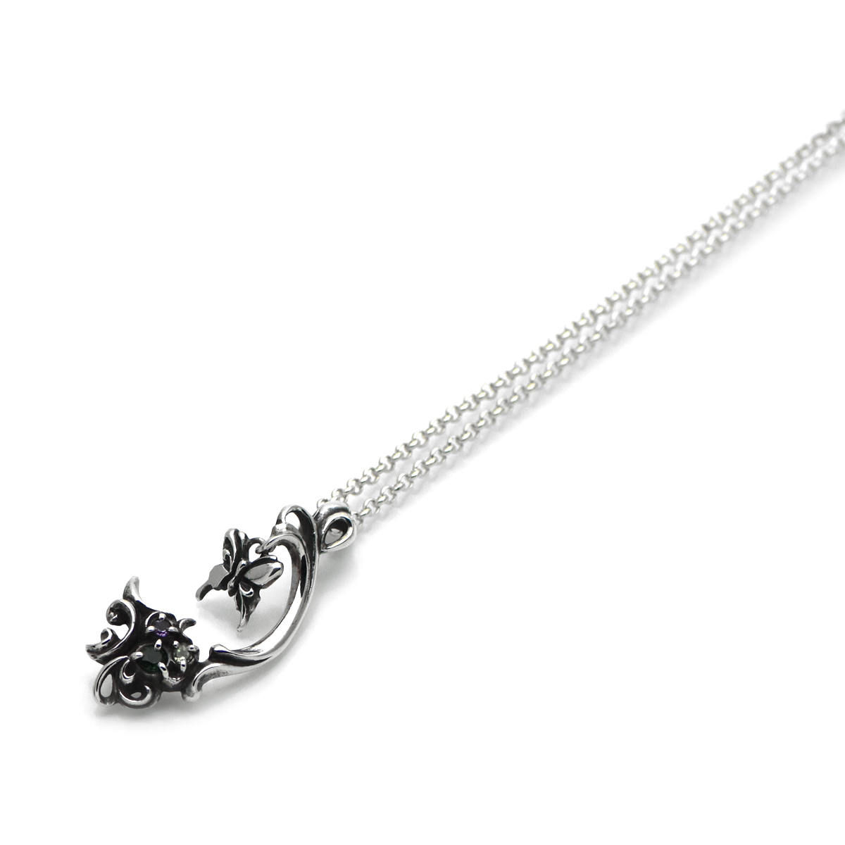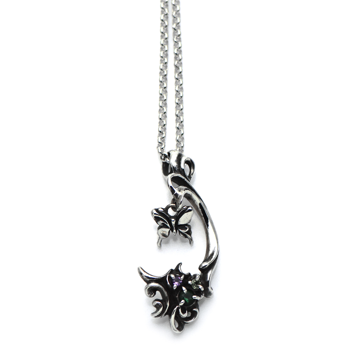 小さなアゲハ蝶と植物デザインのシルバーペンダント。
