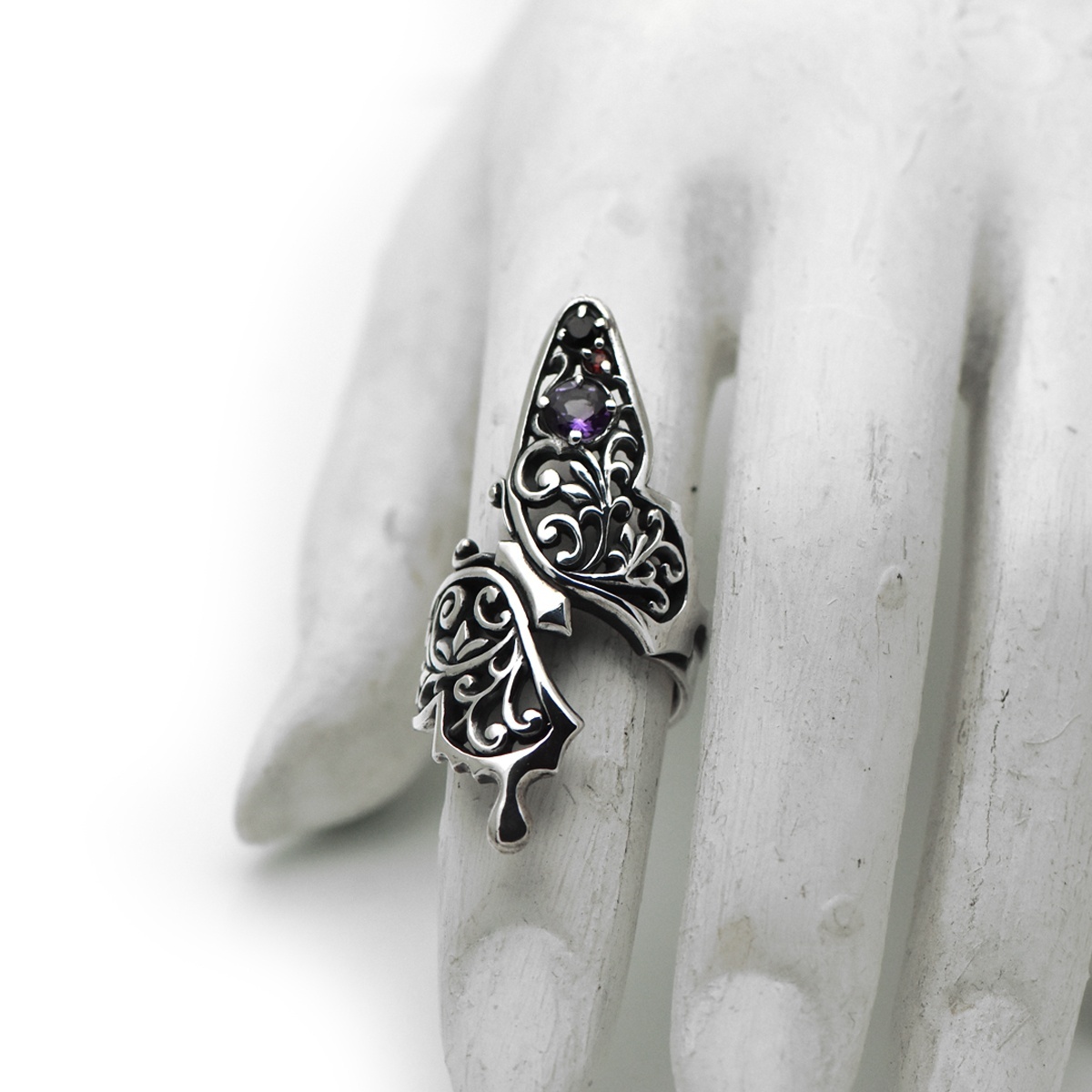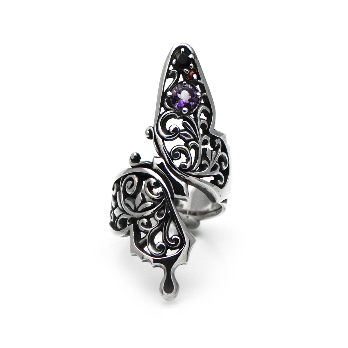 指元を大胆に取り巻くアゲハ蝶のシルバーリング。