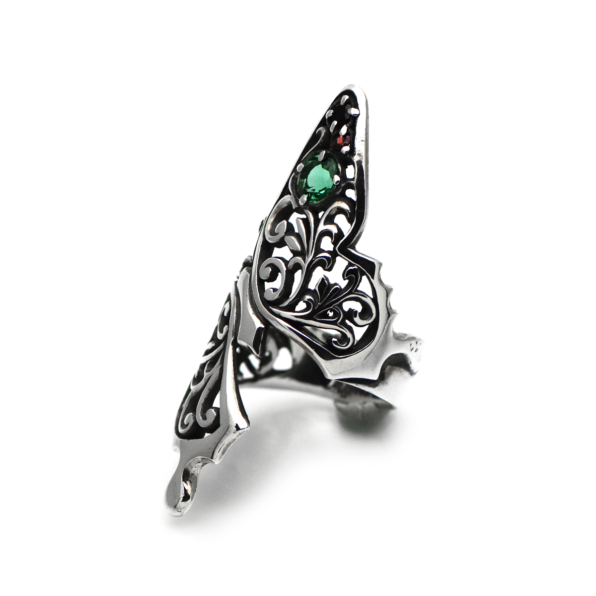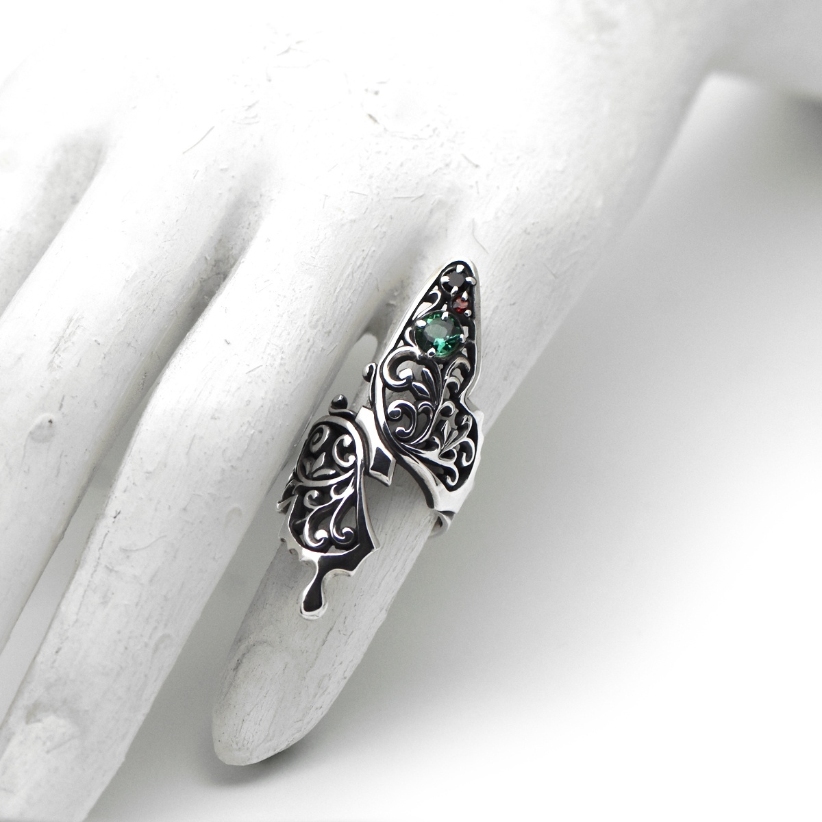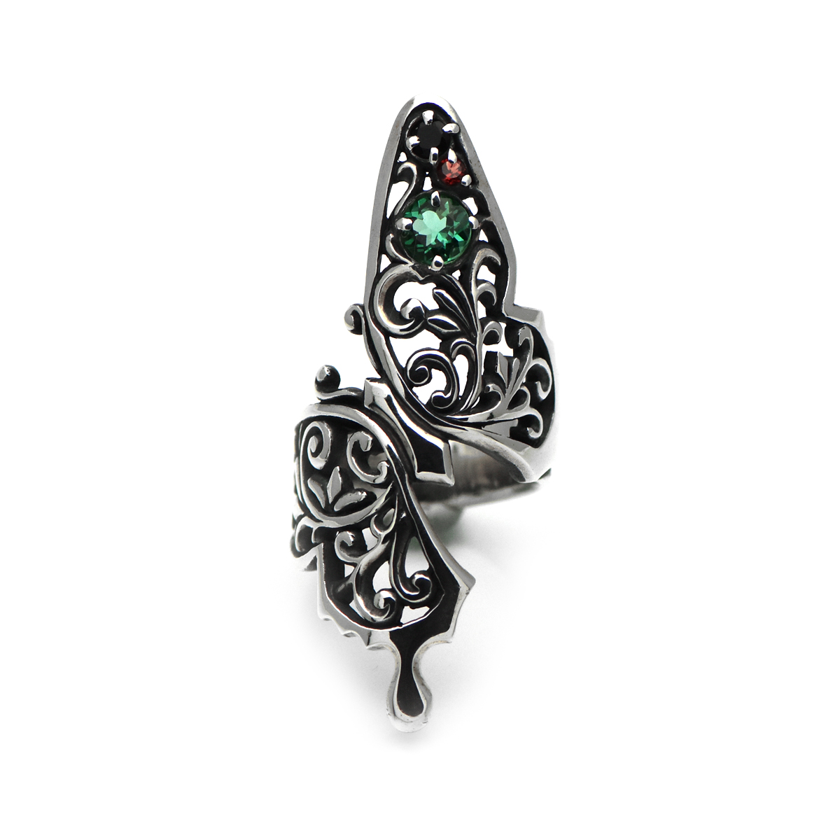 指元を大胆に取り巻くアゲハ蝶のシルバーリング。