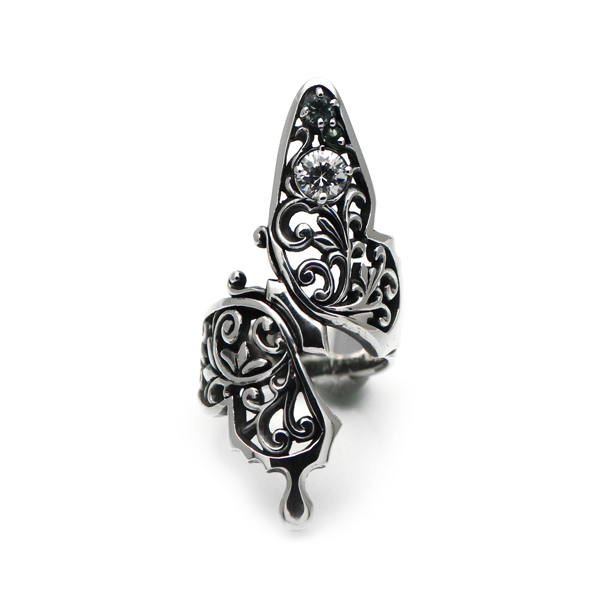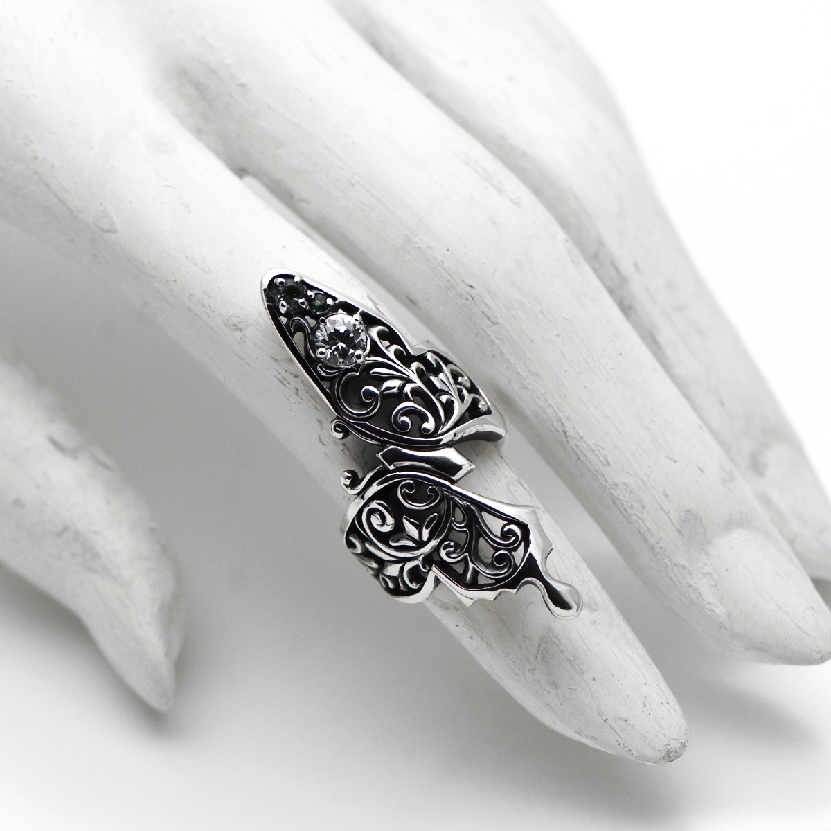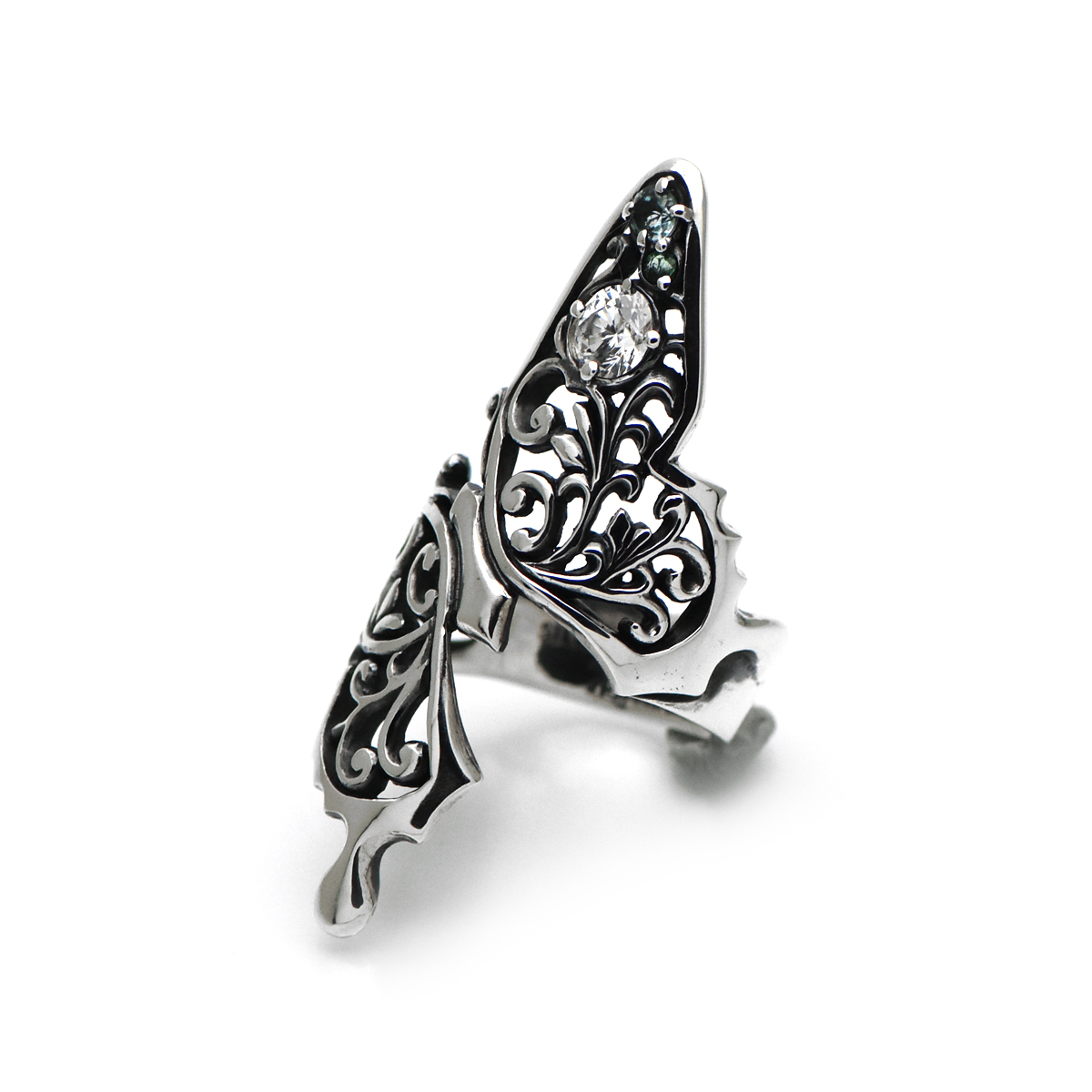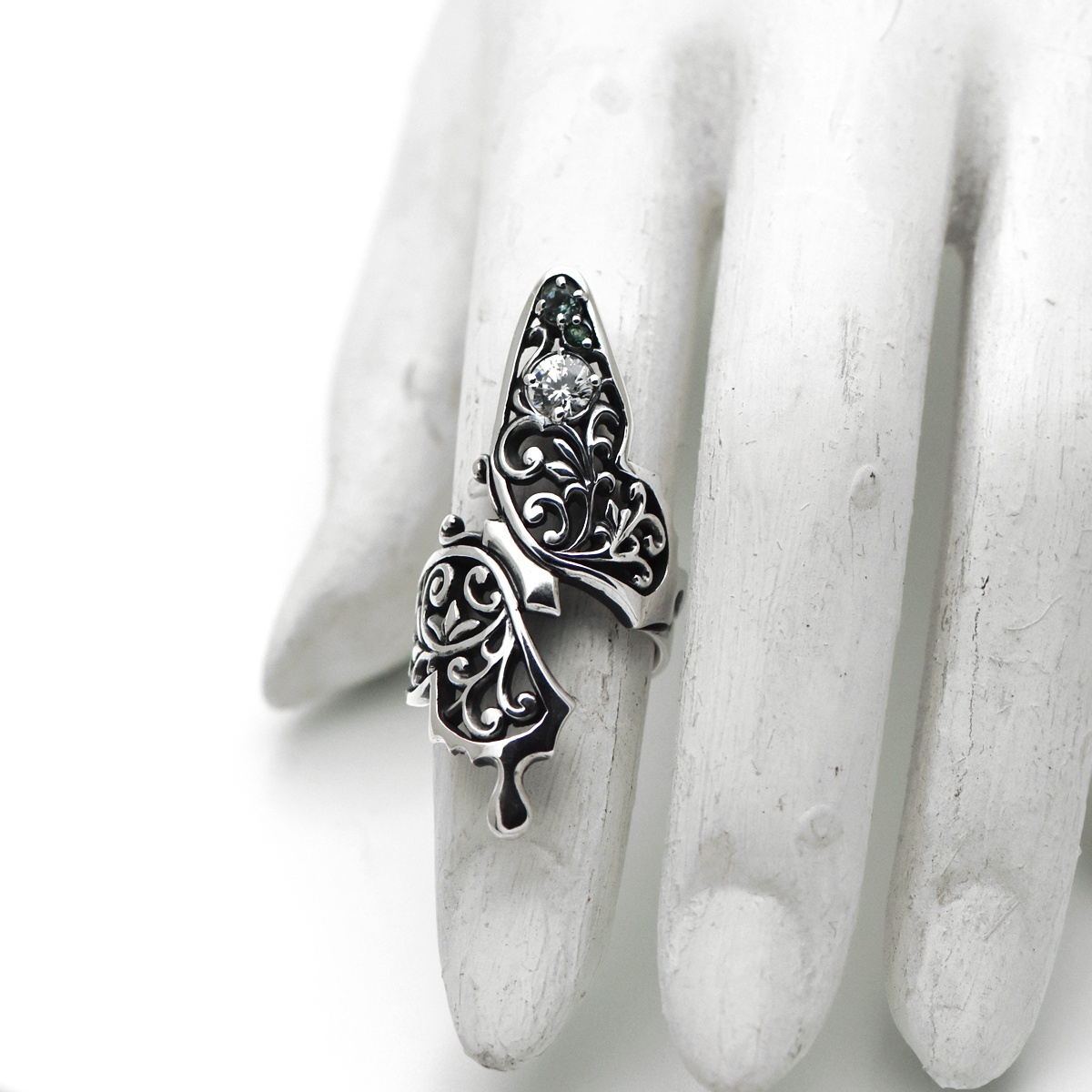 指元を大胆に取り巻くアゲハ蝶のシルバーリング。
