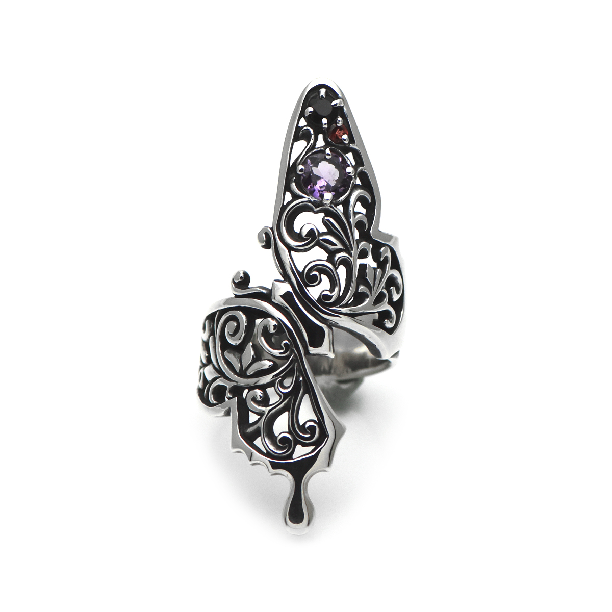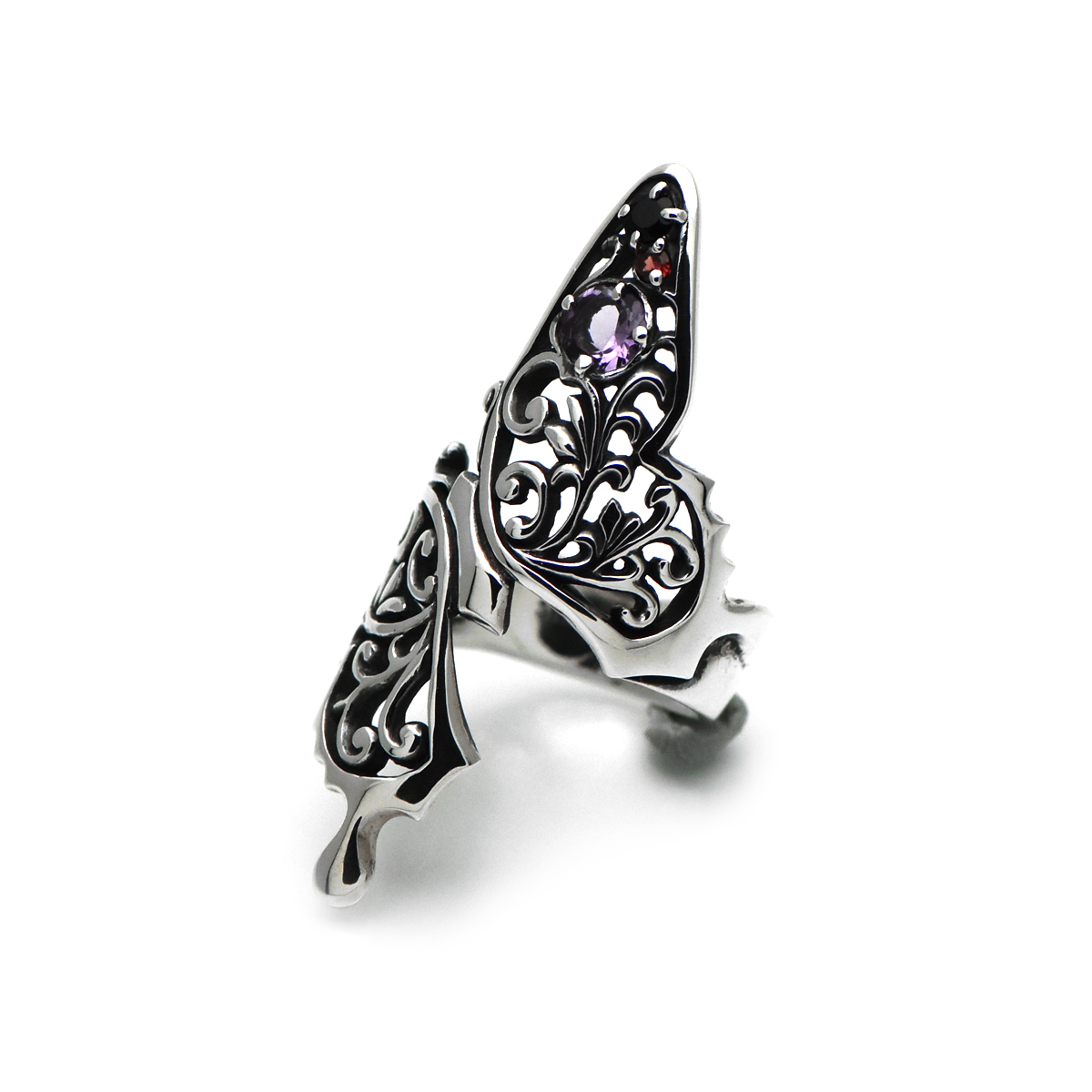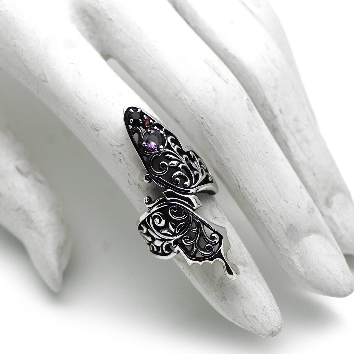 指元を大胆に取り巻くアゲハ蝶のシルバーリング。