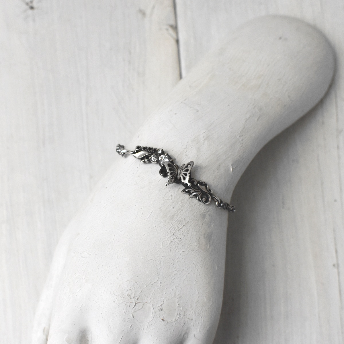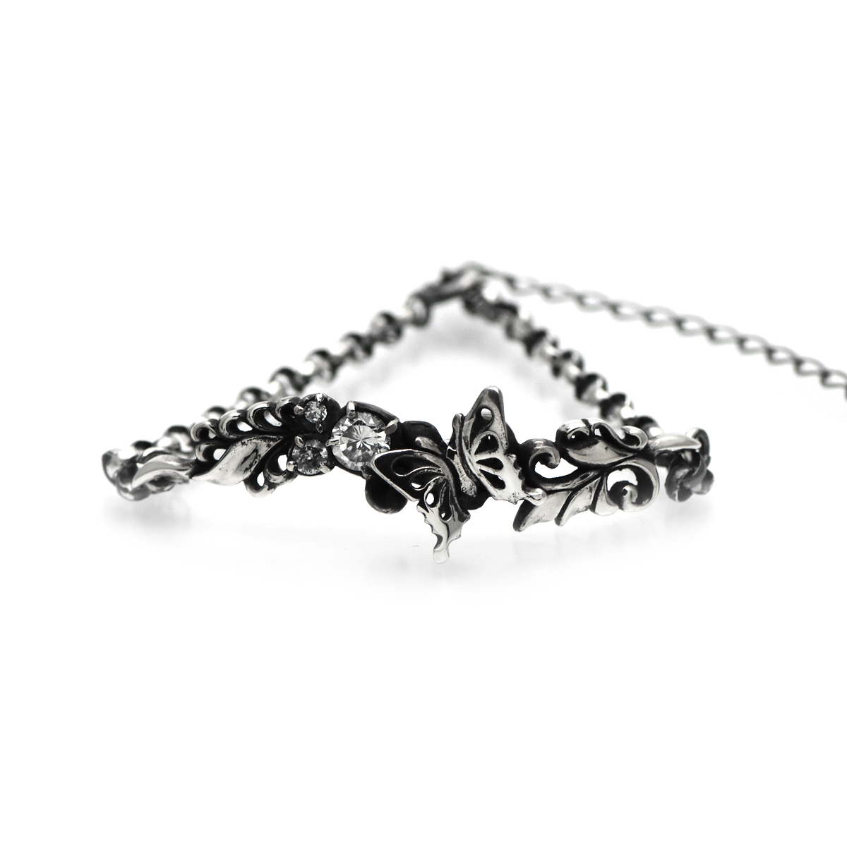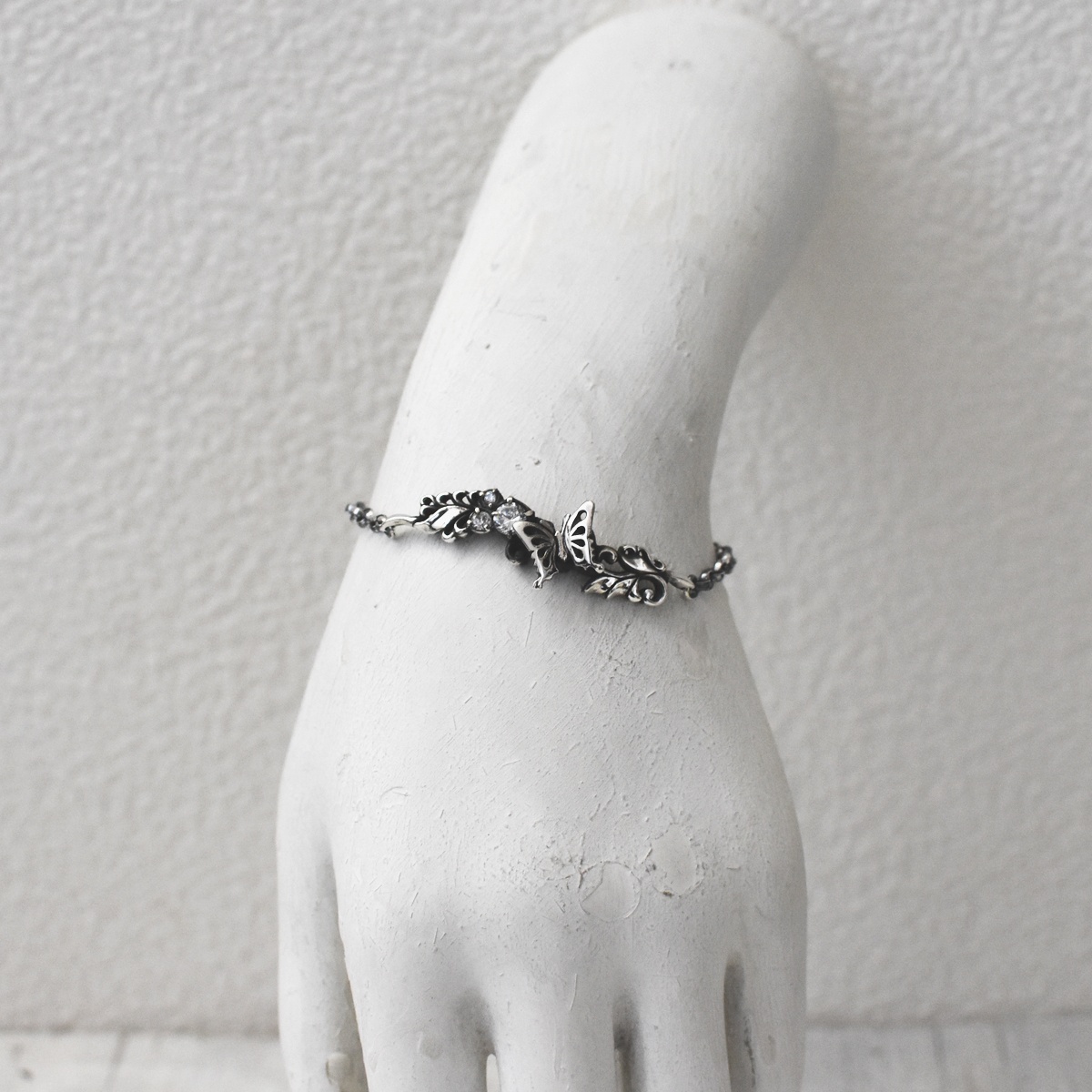 腕を取り巻く草花にとまっている今にも飛び立ちそうなアゲハ蝶がかわいいシルバーブレスレット。