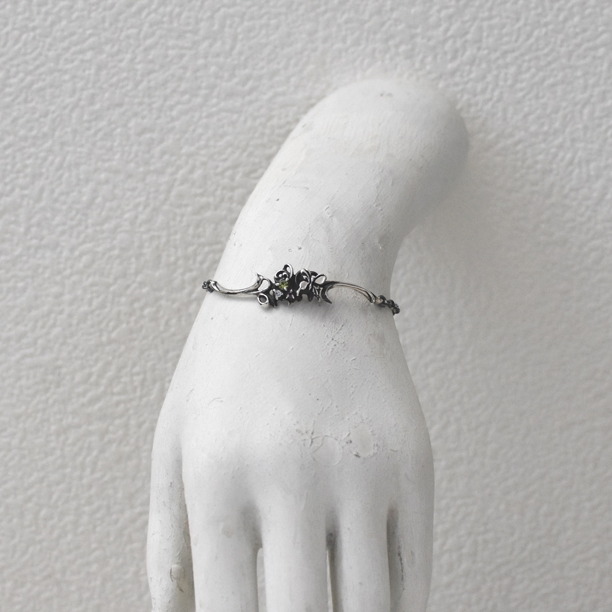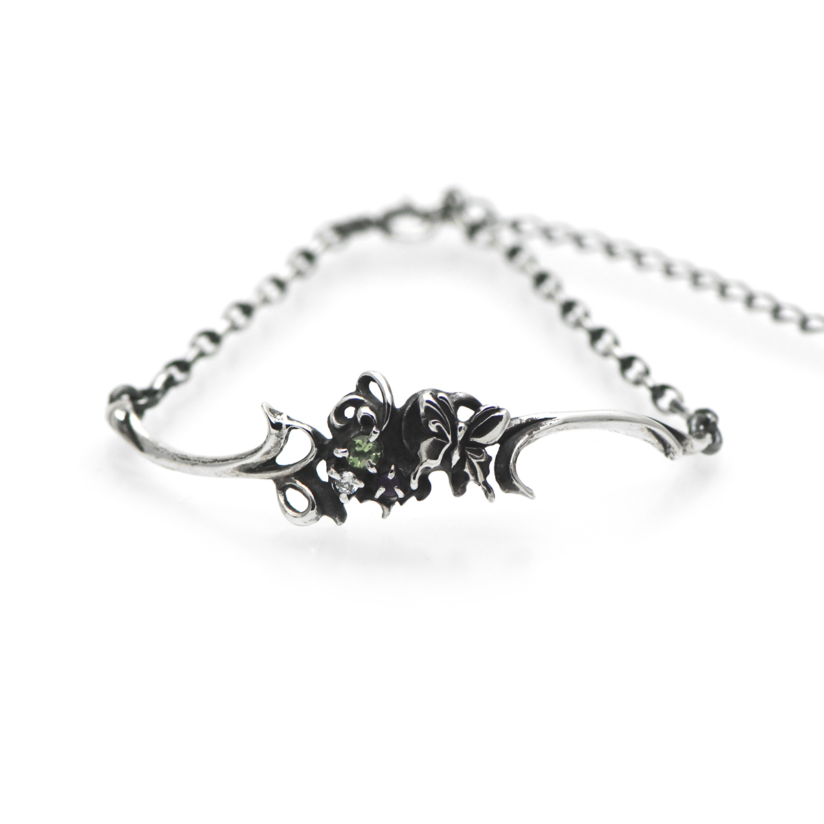 細部までつくり込まれた綺麗なラインの植物に蝶がとまっているシルバーチェーンブレスレット。