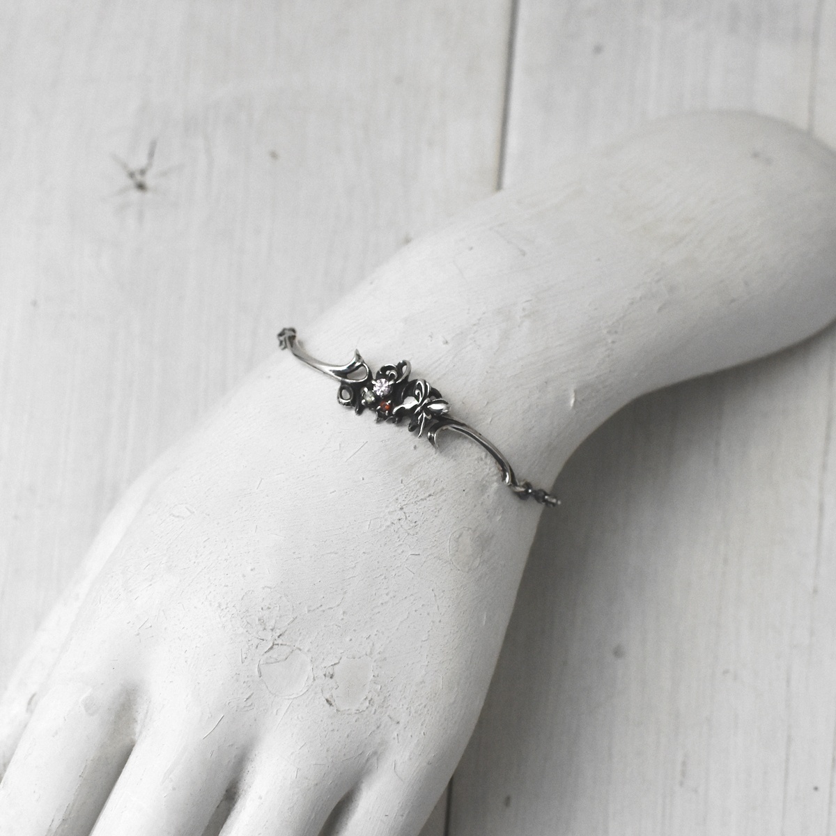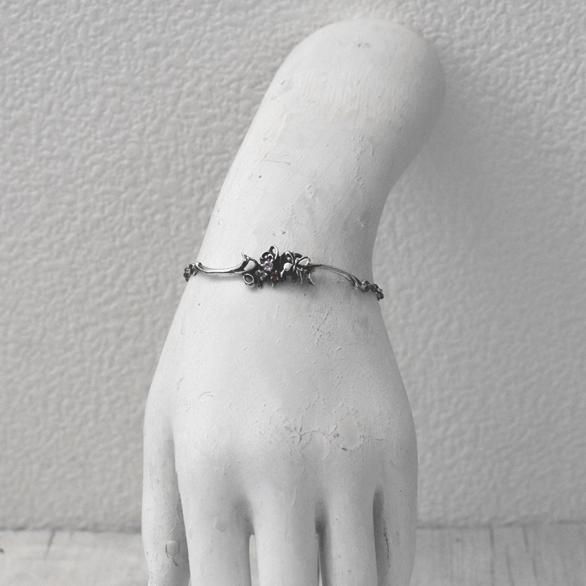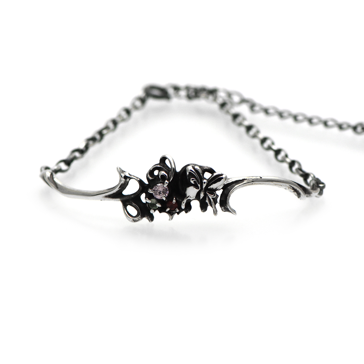細部までつくり込まれた綺麗なラインの植物に蝶がとまっているシルバーチェーンブレスレット。
